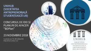Concursul de idei și planuri de afaceri “BDPlan” este organizat de către UNIHUB (Societatea Antreprenorială Studențească a Universității din București), în data de 23 noiembrie 2018. Evenimentul vine în completarea seriei de evenimente dedicate “Săptămânii Antreprenoriatului”.