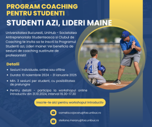 Universitatea din Bucuresti, UniHub – Societatea Antreprenoriala Studenteasca, in parteneriat cu Clubul de Coaching lanseaza Studenți astăzi, lideri mâine, program de coaching destinat studentilor si masteranzilor din toate specializarile universitare.