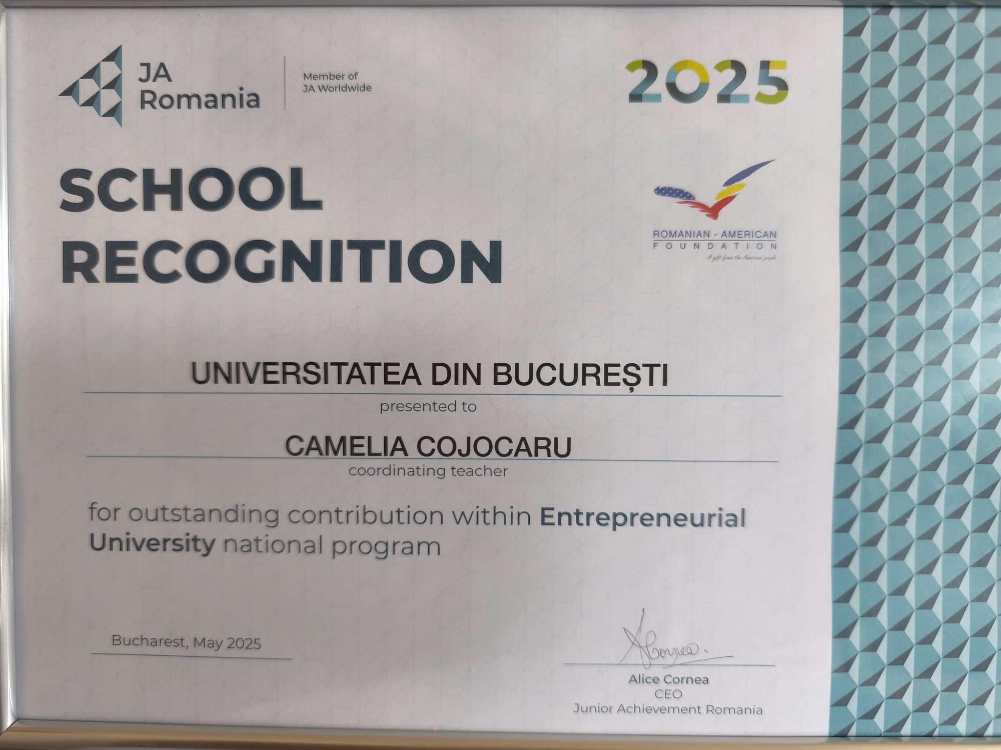 Universitatea din București a fost premiată pentru contribuția sa semnificativă la promovarea educației antreprenoriale în rândul studenților, prin participarea activă în competițiile și programele JA. Distincția „School Recognition for Outstanding Contribution”, acordată în cadrul programului Entrepreneurial University, este încă o recunoaștere a angajamentului constant al Universității din București pentru dezvoltarea educației antreprenoriale.